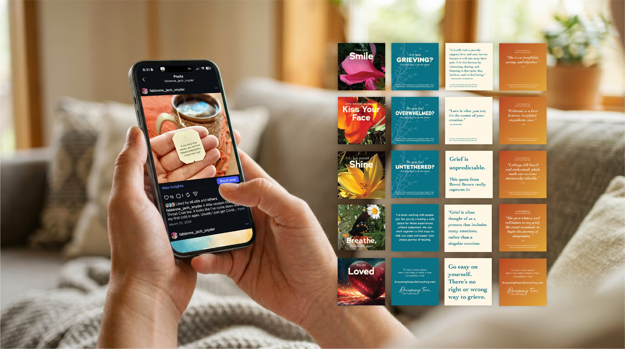 I developed a five-template weekly social content system for Instagram, deployed on a monthly cadence. Each template was purpose-built for a distinct content type—testimonial, expert quotes, inspirational, grief and loss call to action, and an unscripted Friday post for lighter, spontaneous content—while maintaining a cohesive visual identity across all five. All post copy was written in-house.