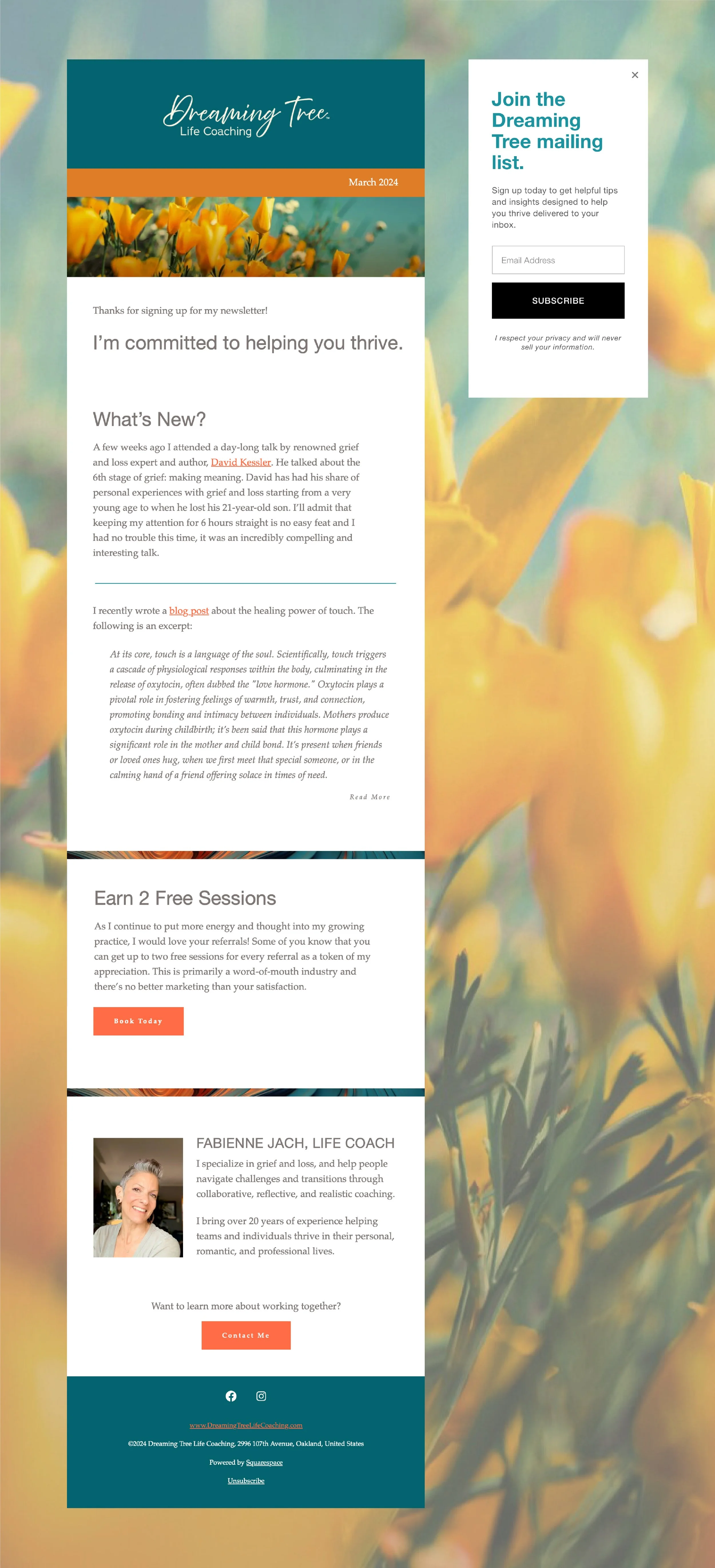 I designed and wrote a branded email newsletter in Squarespace Email Campaigns, extending the Dreaming Tree visual identity into a new format.