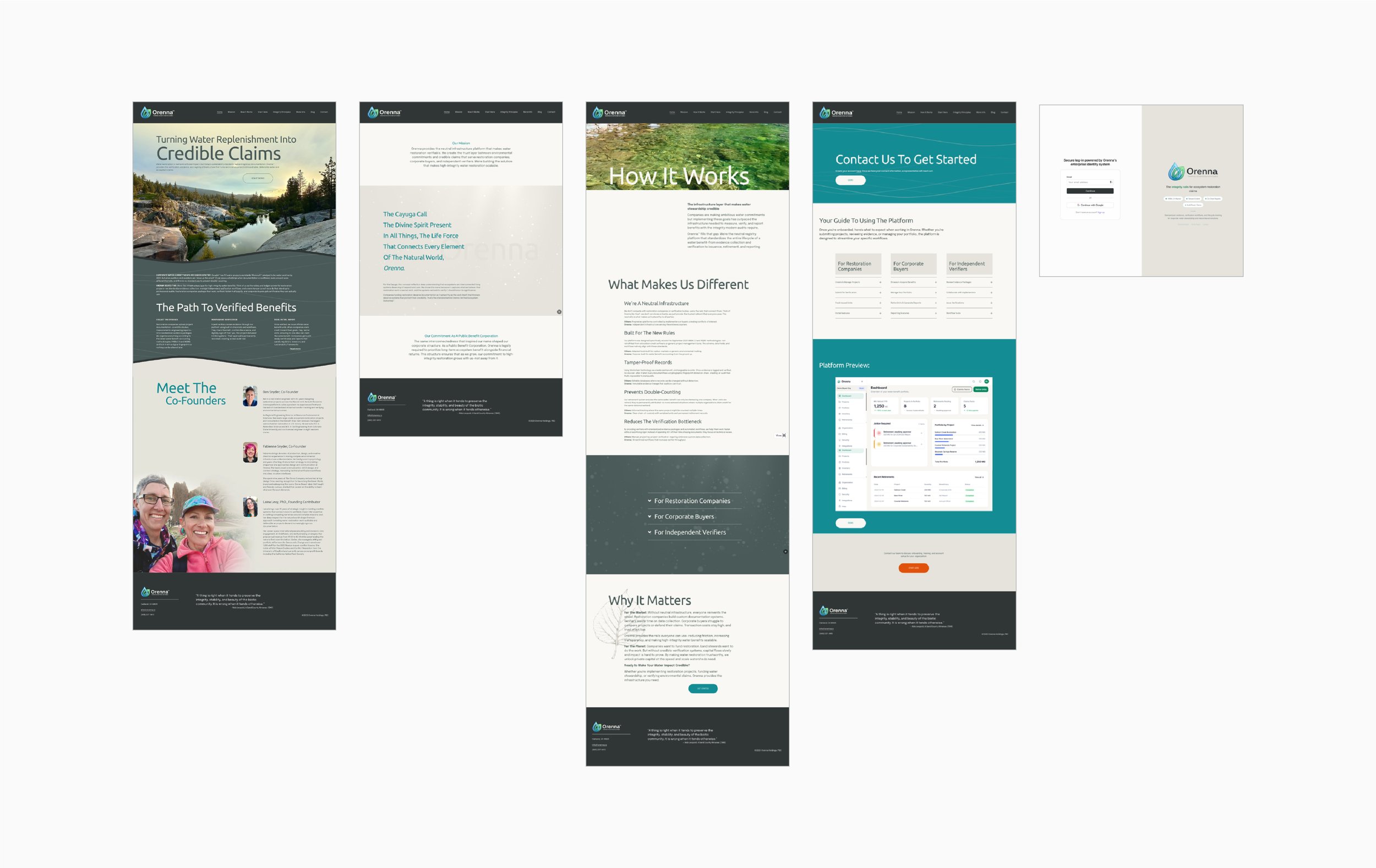 Orenna is a water restoration verification and registry platform built for enterprise clients. From the beginning, the design challenge was clear: create a digital experience that felt credible, modern, and purposeful — one that could speak to sophisticated users without losing the humanity at the heart of what water restoration means.